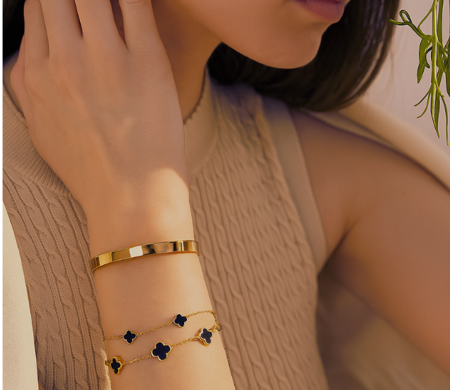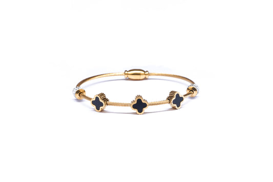 Add a touch of elegance to your everyday look with this gold clover & stone bracelet set. Featuring one sleek bangle with shimmering stones and another with delicate black clover charms, this combo brings together minimal style with a hint of sparkle. Care: Keep away from water, perfumes, spray, and other...