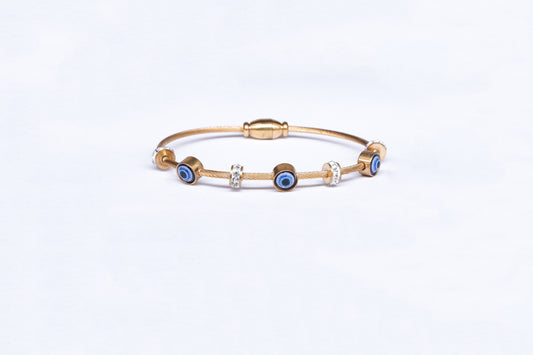 This unique bangle bracelet blends modern style with a touch of ancient symbolism. The delicate gold-toned wire wraps elegantly around your wrist, adorned with beautiful evil eye charms and sparkling crystal spacers. This versatile bracelet is lightweight and comfortable for everyday wear. It’s perfect for layering with other pieces or...