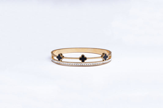 Elegant and versatile, this golden kada bracelet features chic black clover charms and crystal-studded accents, symbolizing luck and timeless style. Designed with a magnet opening, it’s easy to wear while ensuring a secure fit. Perfect for both daily wear and special occasions. Care: Keep away from water, perfumes, spray, and...