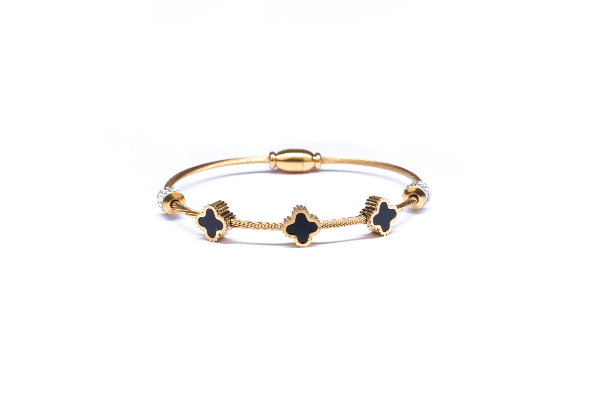 Elegant and versatile, this golden kada bracelet features chic black clover charms and crystal-studded accents, symbolizing luck and timeless style. Designed with a magnet opening, it’s easy to wear while ensuring a secure fit. Perfect for both daily wear and special occasions.