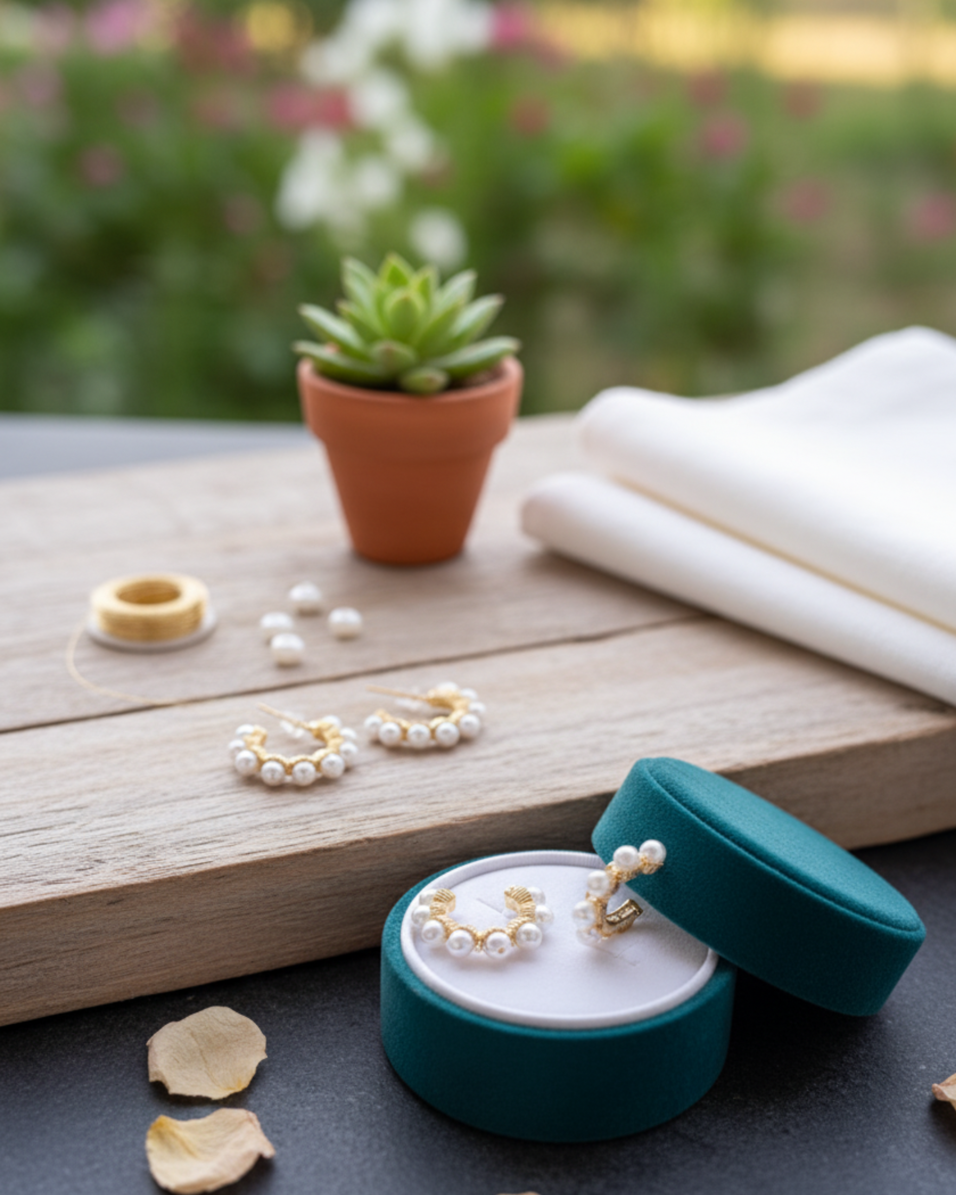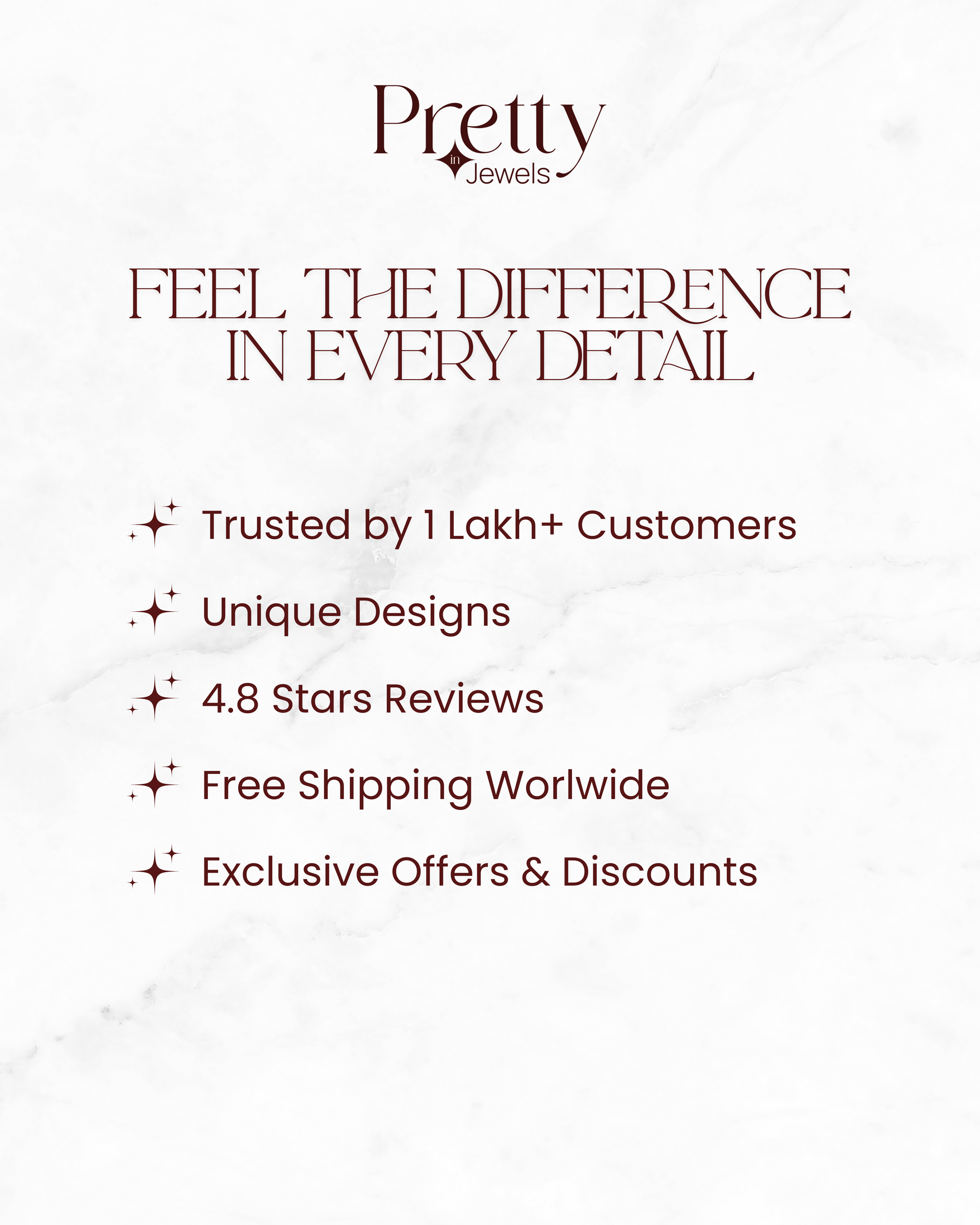 Care: Keep away from water, perfumes, spray, and other chemicals, as well as harsh sunlight. Store in an air-tight container or zip-lock bag when not in use to prevent discoloration. Clean your jewellery with dry soft fabric after every use.