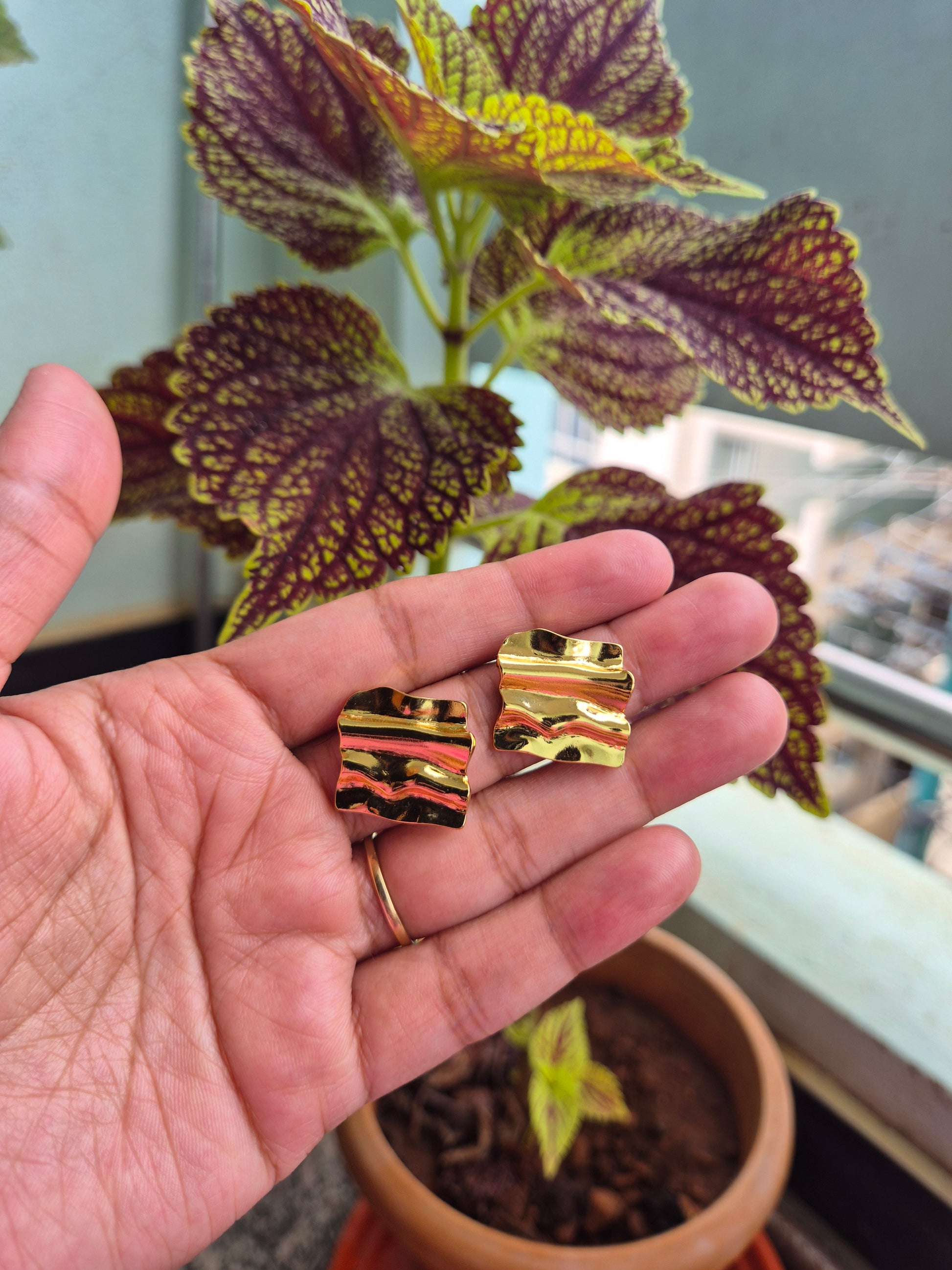Elevate your everyday look with these gold-textured square stud earrings. Featuring a unique wavy surface design with a glossy finish, these studs bring a modern and artistic touch to any outfit. Minimal yet striking, they are perfect for office wear, casual outings, or evening occasions.